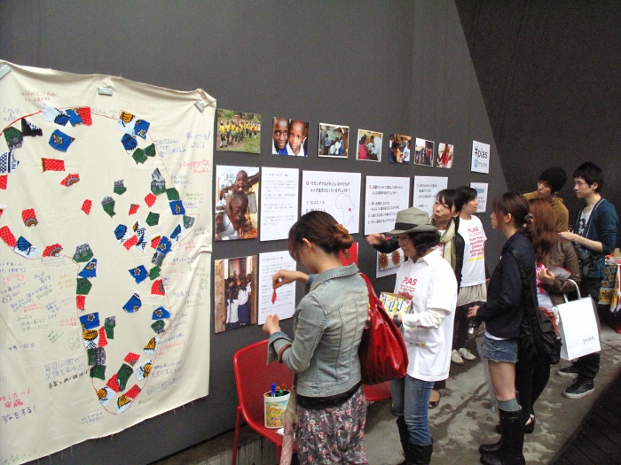 グンゼ株式会社様のご協力で、スタイリッシュな店舗テラスを使わせていただき、ケニアとウガンダのアクセサリーを中心に販売するアフリカンマーケットや、エイズ孤児について知ることができるワークショップを開きました。