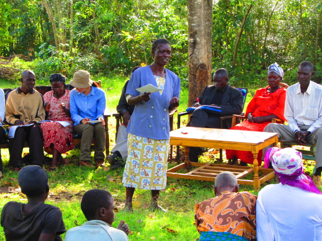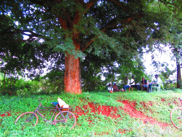 ケニアの太陽がギラギラと照りつける真夏日、トトロが出てきそうな大きな木の下で啓発リーダー達と先月の活動をふり返る月例反省会を持ちました。