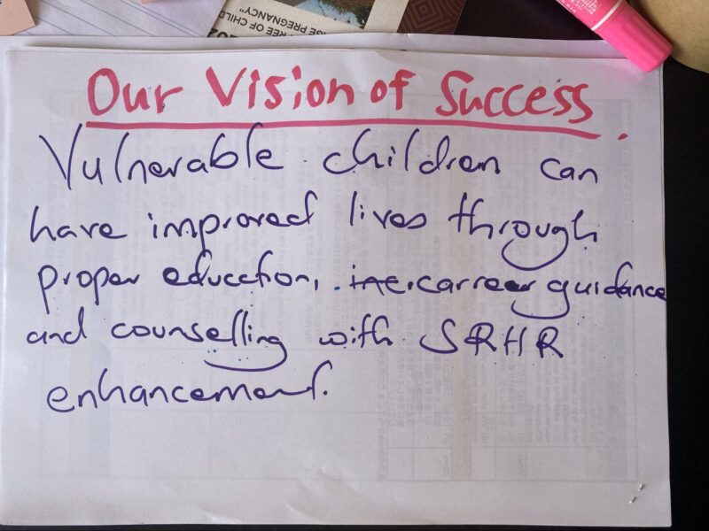 今回のワークショップでは、「脆弱な子どもたちが適切な教育とキャリアサポートやSRHR向上を含めたカウンセリングにアクセスすることで、より良い人生を歩むことができる」というビジョン・オブ・サクセスが生まれました。
