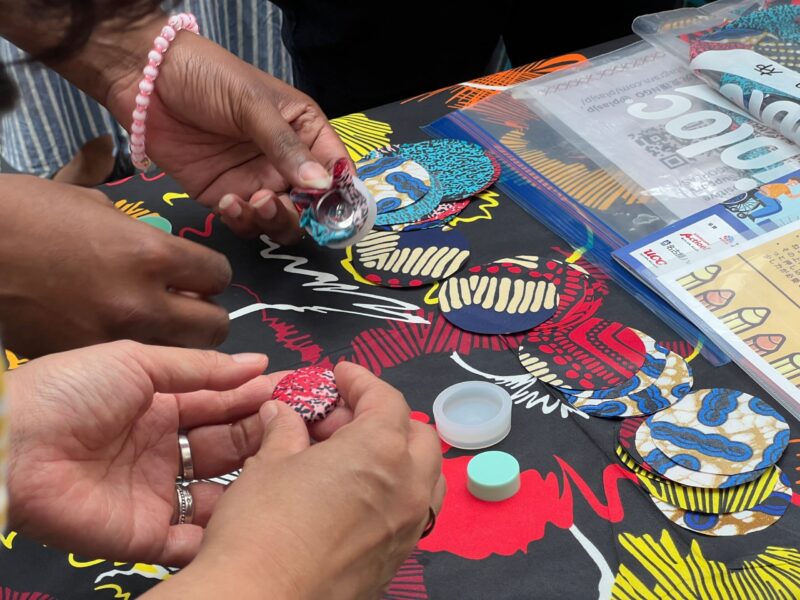 PLASの出展ブースでは、ボランティアさんやインターンとともに活動紹介、アフリカの地図づくりなどを行いました。中でもケニアやウガンダの女性たちが身にまとっている「カンガ」と呼ばれる布を使って、くるみボタンを製作するワークショップは女性や子どもたちに大人気でした。