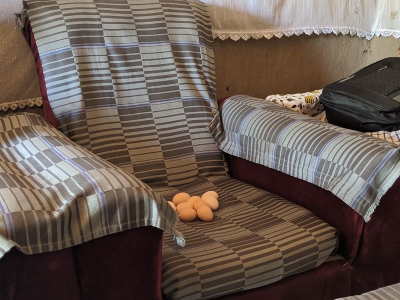 迎え入れてくれたお家の居間のソファには、「ここを巣にしてしまったの。」と、鶏の卵が8個。ちょうど出かけていましたが、母鶏が家の中で卵を温めていました。
