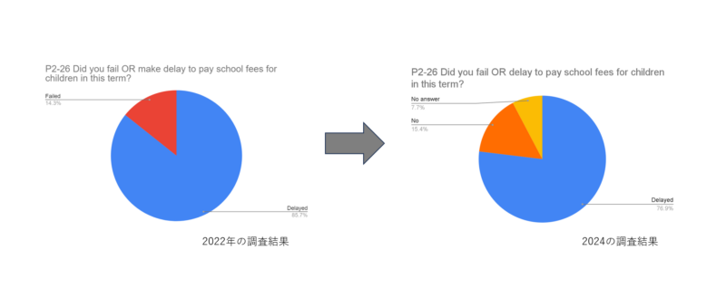 また、プログラム開始時には半数しか貯蓄を行っていませんでしたが、プログラム後調査では有効回答者全員が貯蓄を実施できており、平均残高も増加傾向にありました。学費の支払い状況も改善傾向にあり、プログラム開始時には学費支払いを行えない人もいましたが、終了時には遅れつつも全プログラム参加家庭が学費を支払うことができていました。