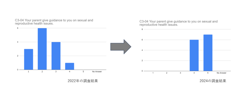 二つ目は家族間でのコミュニケーションの向上です。プログラム終了後の調査では、より多くの子どもたちが保護者が学業面でのサポートをしてくれていると回答したり、心や体の相談を行いやすくなったと回答しています。