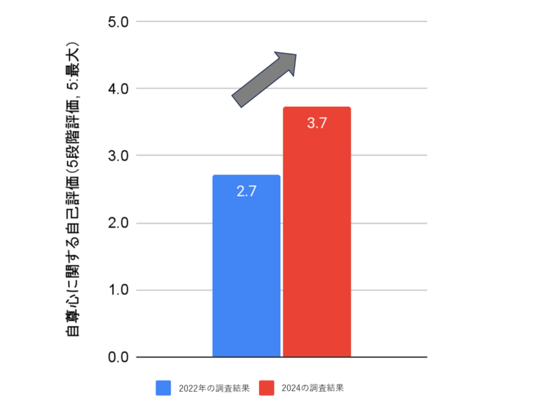 三つ目は自己肯定感の大幅な向上でした。保護者ではプログラム開始前の2.7(最大値5)から終了時には3.7、子どもでは2.0(最大値5)から4.2へ、2倍以上の違いが生まれました。